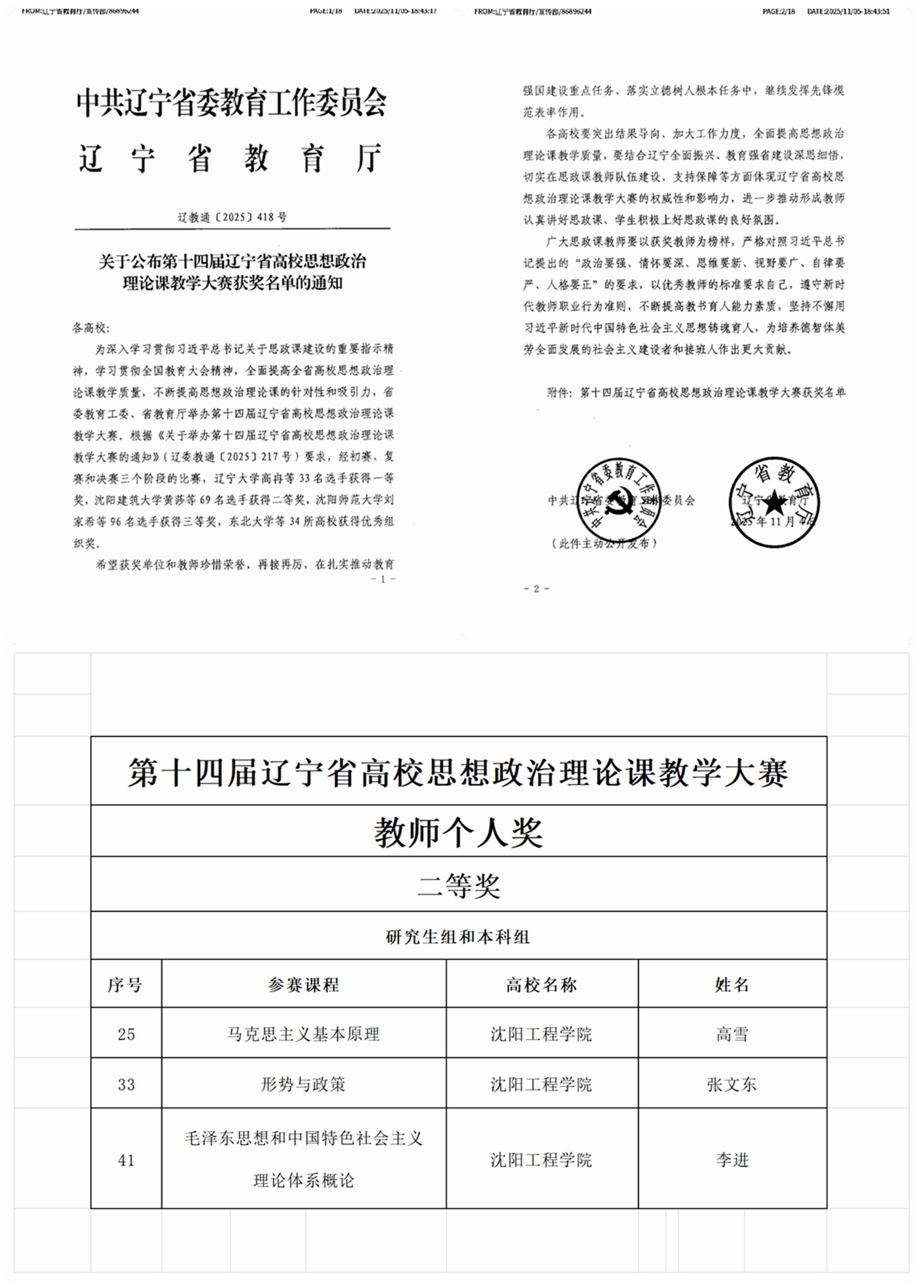 近日,由中共辽宁省委教育工作委员会、辽宁省教育厅主办的第十四届辽宁省高等学校思想政治理论课教学大赛传来捷报,学校马克思主义学院教师高雪荣获《马克思主义基本原理》课程组二等奖、张文东荣获《形势与政策》课程组二等奖、李进荣获《毛泽东思想和中国特色社会主义理论体系概论》课程组二等奖。成绩的取得彰显了学校思想政治理论课教师队伍的高水平教学实力和昂扬向上的精神风貌。