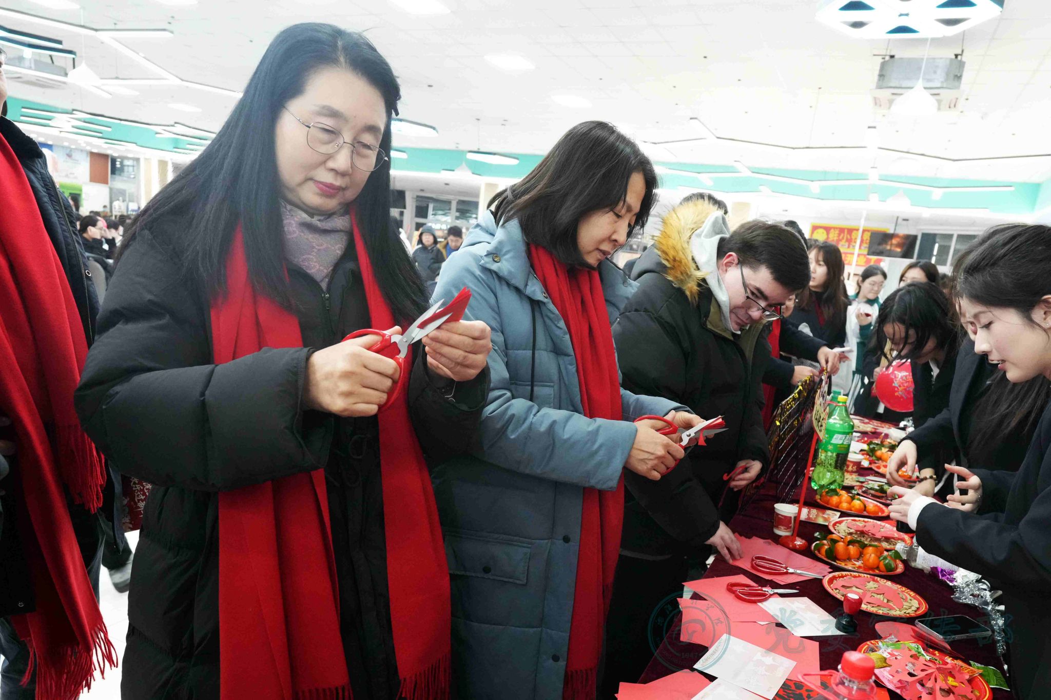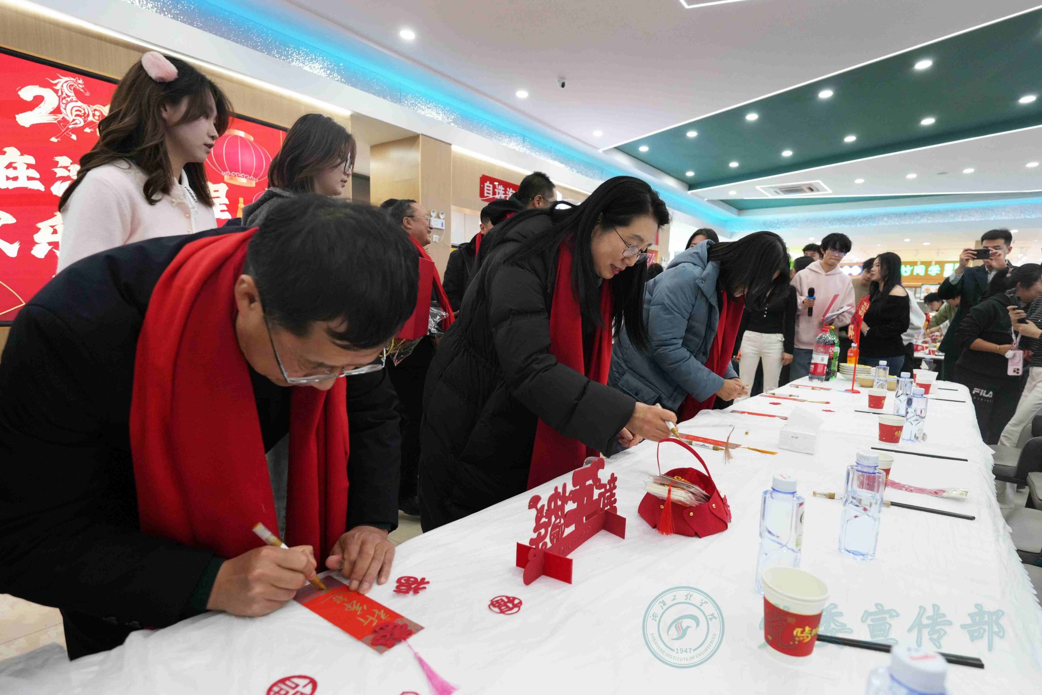 学校始终秉持“围绕学生、服务学生、关照学生”的育人理念,并将其深度融入校园生活的方方面面。活动现场亮点纷呈,在延续往年饺子文化特色的基础上,创新融入多项传统文化元素,让新生们在味蕾与精神的双重享受中感受校园温情。各二级学院精心布置活动现场,红灯笼高悬、福字贴纸点缀、丰富多彩的联欢环节。传统装饰与青春气息交相辉映,营造出喜庆热闹又温馨祥和的节日氛围。非遗文化体验成为本次活动的一大特色:非遗糖画技艺精湛,书法爱好者现场挥毫泼墨,剪纸摊前巧手翻飞,猜灯谜处人潮涌动,投壶区域欢声笑语不断。校学生会的同学们身着传统大花袄,肩上扛着插满红彤彤糖葫芦的稻草把子,穿梭在活动现场,成为一道极具民俗特色的风景线。可爱的“马年公仔”纪念礼品,成为同学们新年专属惊喜。