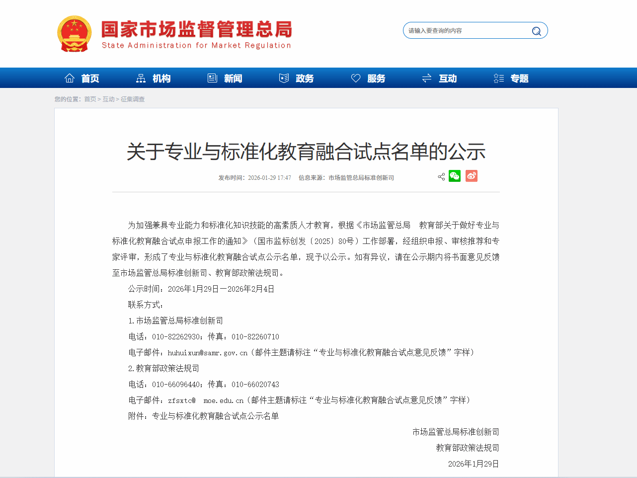 近日,国家市场监督管理总局、教育部联合公布全国专业与标准化教育融合试点公示名单,学校经济管理与法学院负责申报的“公共教育培养模式”项目和电气工程学院负责申报的“专业教育培养模式”项目成功入选,学校成为辽宁省入选的11所高校之一,标志着学校在深化产教融合、培养复合型人才方面取得重要进展。