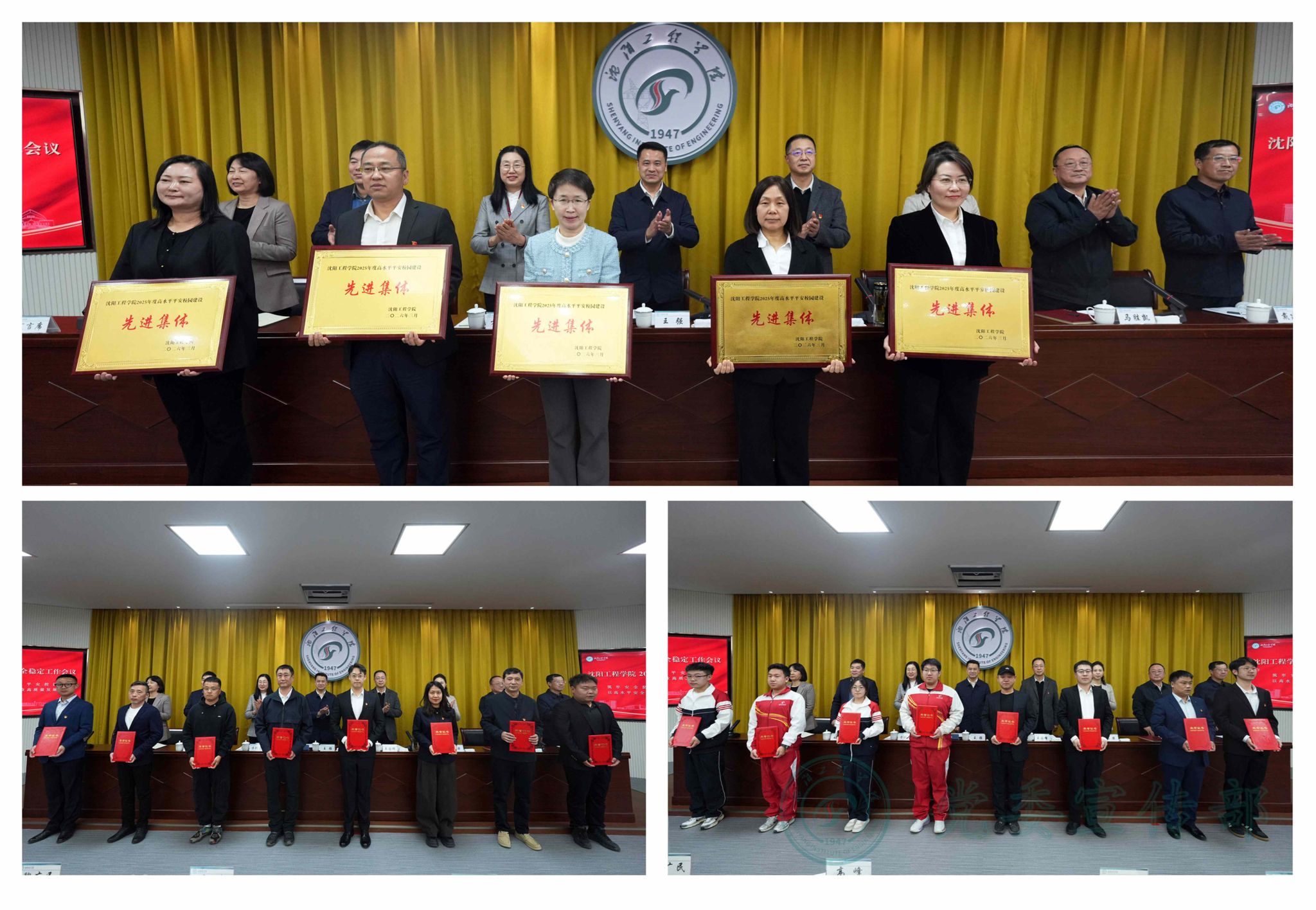 会上,党委副书记方鸿志宣读了《关于表彰沈阳工程学院2025年度高水平平安校园建设先进集体、优秀个人的决定》。与会领导为5个先进集体和21名优秀个人代表颁发了荣誉证书。工程训练中心主任马仕海、后勤中心办公室主任庄少杰、机械工程学院学生刘则序分别作经验交流发言。