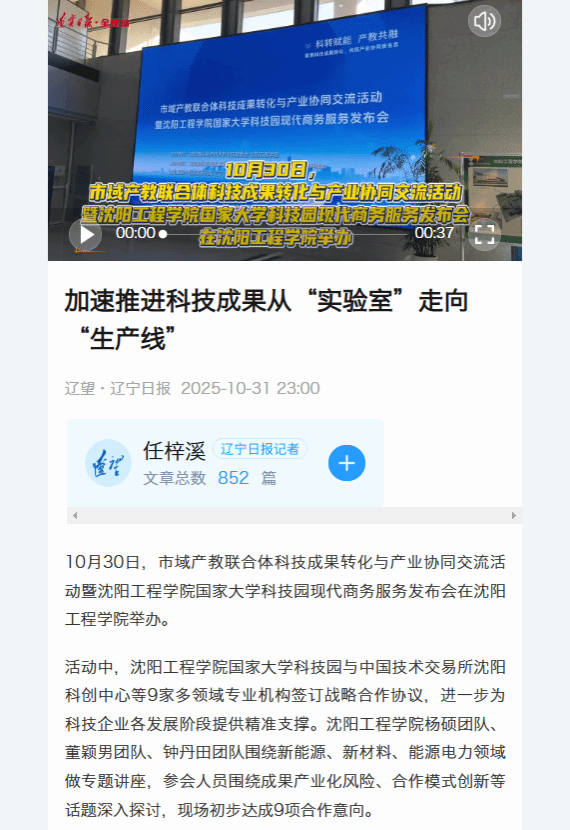 学习强国辽宁学习平台:沈阳工程学院:加速推进科技成果从“实验室”走向“生产线”