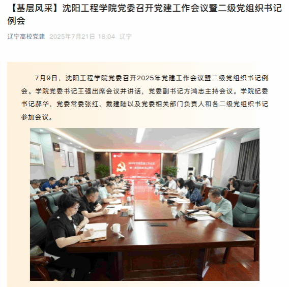编者按:7月21日,辽宁高校党建以“【基层风采】沈阳工程学院党委召开党建工作会议暨二级党组织书记例会”为题,就我校党委召开党建工作会议暨二级党组织书记例会,总结上半年党建工作成效,部署下半年党建工作要求一事进行报道。现将报道原文转载如下: