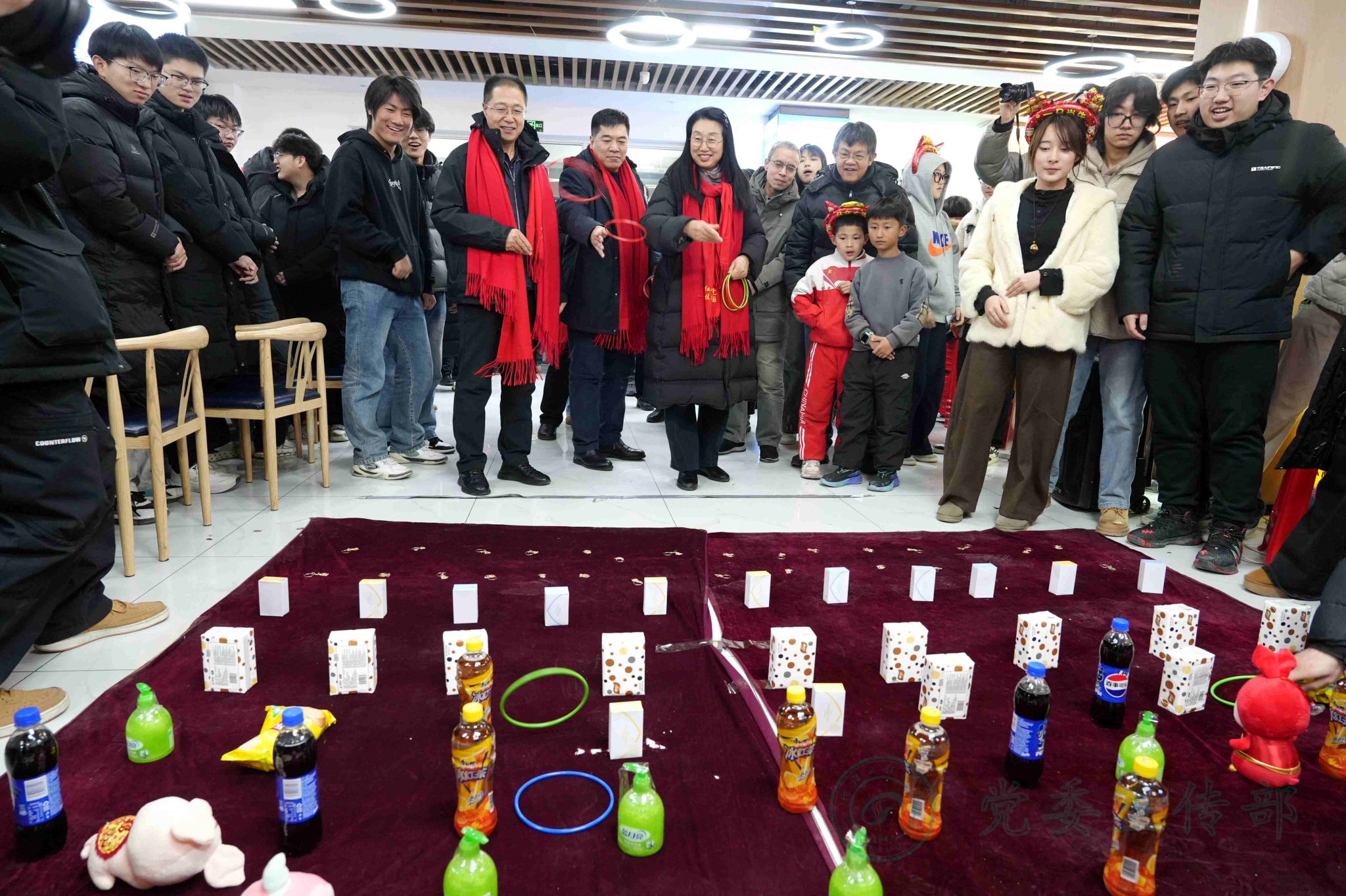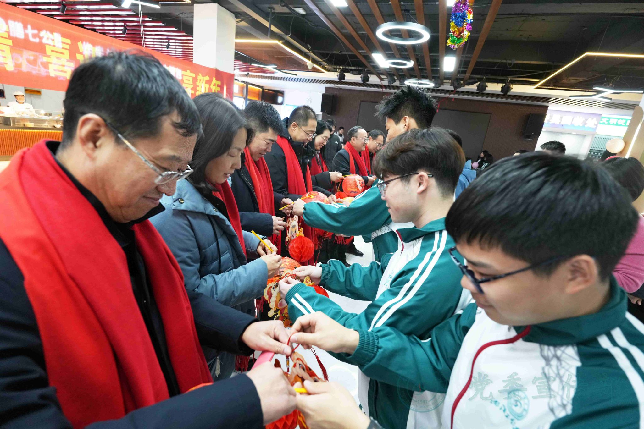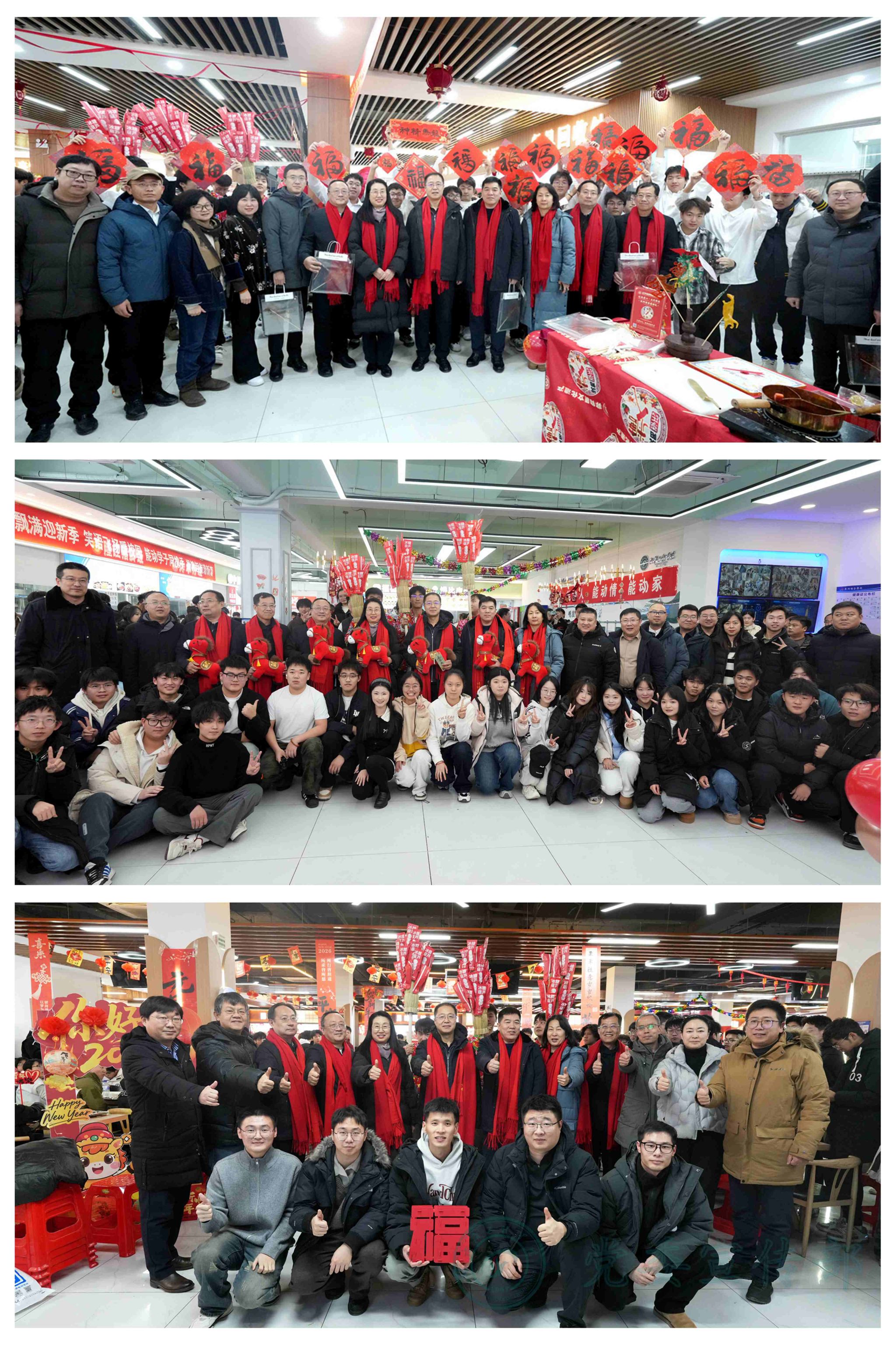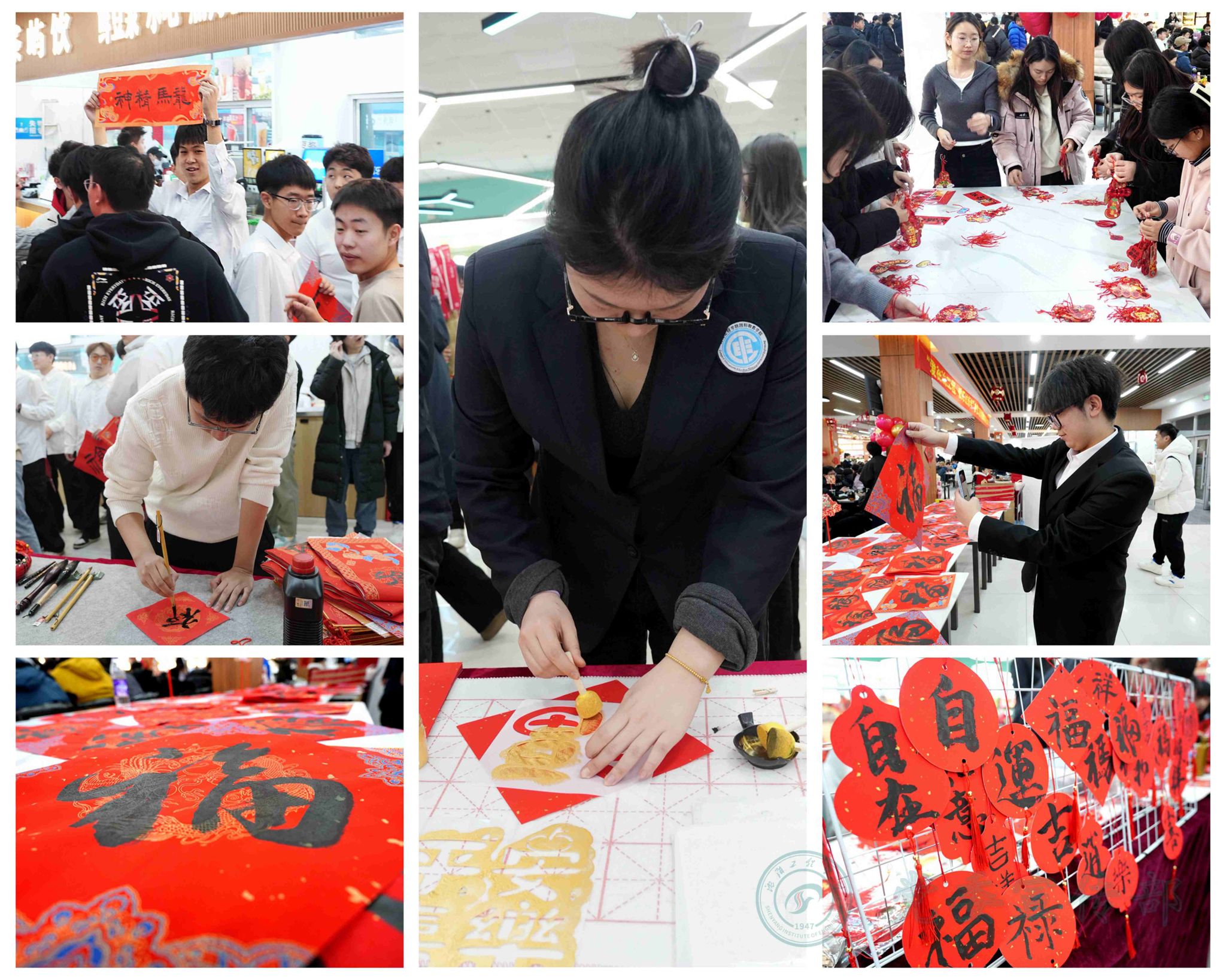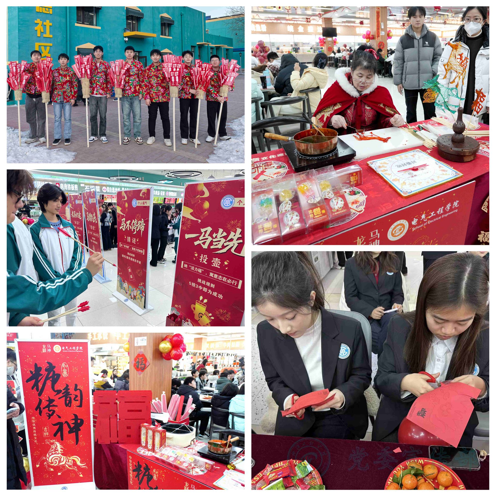 学校始终秉持“围绕学生、服务学生、关照学生”的育人理念,并将其深度融入校园生活的方方面面。活动现场亮点纷呈,在延续往年饺子文化特色的基础上,创新融入多项传统文化元素,让新生们在味蕾与精神的双重享受中感受校园温情。各二级学院精心布置活动现场,红灯笼高悬、福字贴纸点缀、丰富多彩的联欢环节。传统装饰与青春气息交相辉映,营造出喜庆热闹又温馨祥和的节日氛围。非遗文化体验成为本次活动的一大特色:非遗糖画技艺精湛,书法爱好者现场挥毫泼墨,剪纸摊前巧手翻飞,猜灯谜处人潮涌动,投壶区域欢声笑语不断。校学生会的同学们身着传统大花袄,肩上扛着插满红彤彤糖葫芦的稻草把子,穿梭在活动现场,成为一道极具民俗特色的风景线。可爱的“马年公仔”纪念礼品,成为同学们新年专属惊喜。