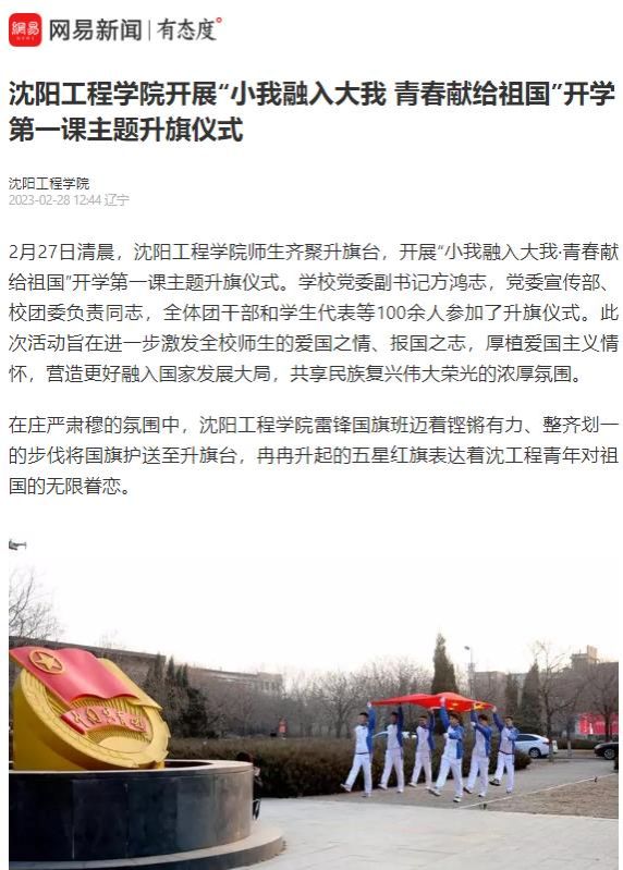 编者按:2月28日,网易新闻以“沈阳工程学院开展‘小我融入大我 青春献给祖国’开学第一课主题升旗仪式”为题就我校的开学第一课之升旗仪式进行报道。现将报道原文转载如下: