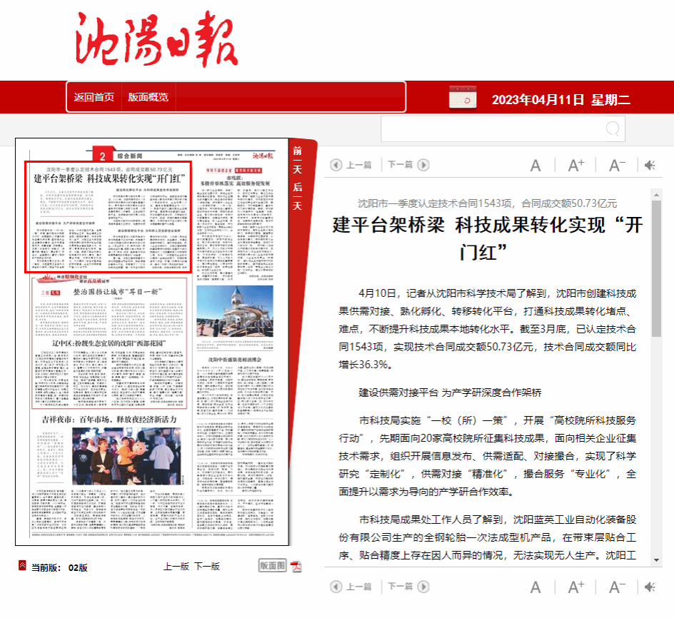 编者按:4月11日,沈阳日报2版综合新闻头条,以“沈阳市一季度认定技术合同1543项,合同成交额50.73亿元,建平台架桥梁科技成果转化实现‘开门红’”为题,就沈阳市创建科技成果供需对接、熟化孵化、转移转化平台,打通科技成果转化堵点、难点,不断提升科技成果本地转化水平进行报道。我校国家大学科技园作为沈阳市科技局落实《沈阳市推进大学科技园建设工作方案》的典型成果代表,积极转移转化平台,为科研人员创新创业架桥。