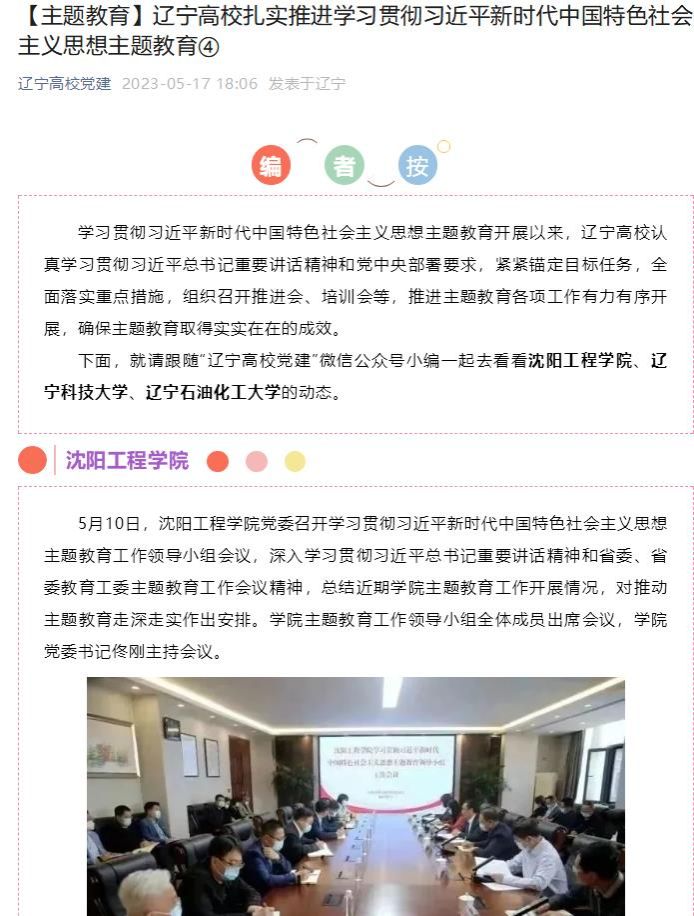 编者按:5月17日,辽宁高校党建以“辽宁高校扎实推进学习贯彻习近平新时代中国特色社会主义思想主题教育④”为题,就包括我校在内的三家省属高校认真学习贯彻习近平总书记重要讲话精神和党中央部署要求,紧紧锚定目标任务,全面落实重点措施,组织召开推进会、培训会等,推进主题教育各项工作有力有序开展,确保主题教育取得实实在在的成效进行专题报道。现将报道原文转载如下:
