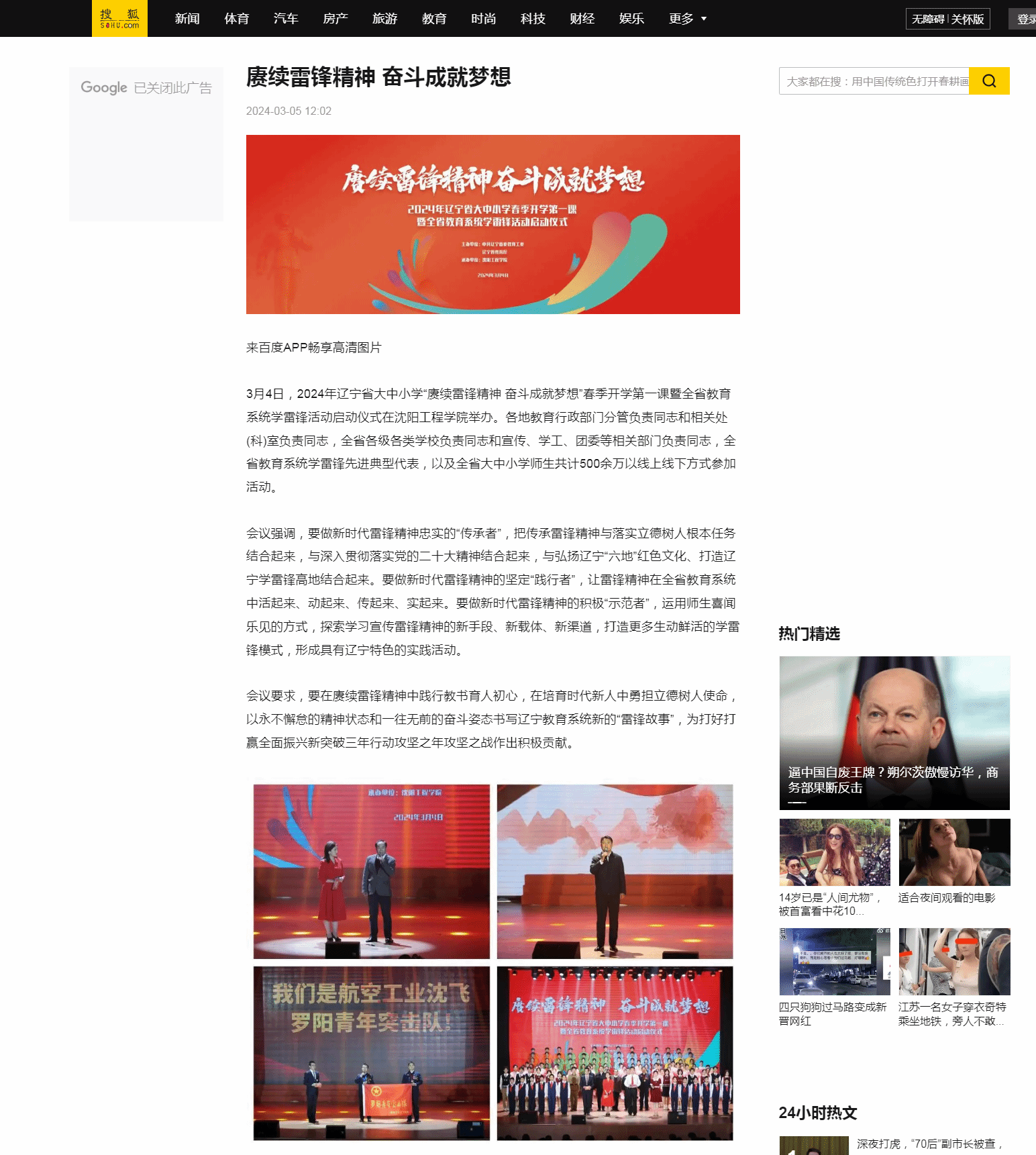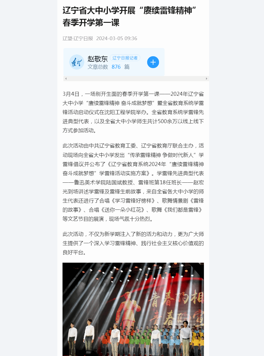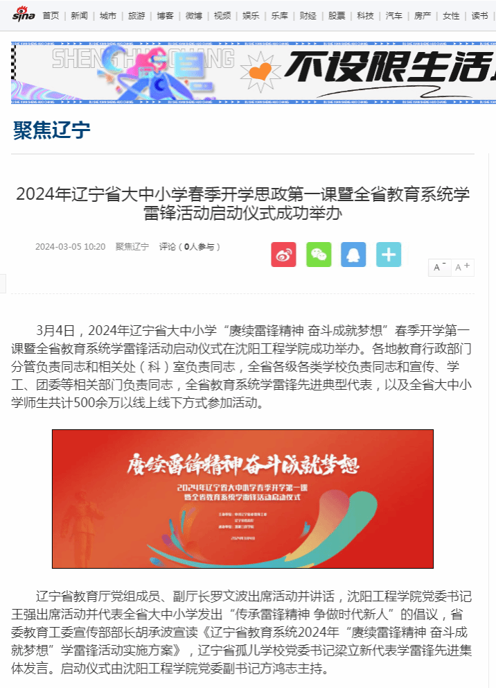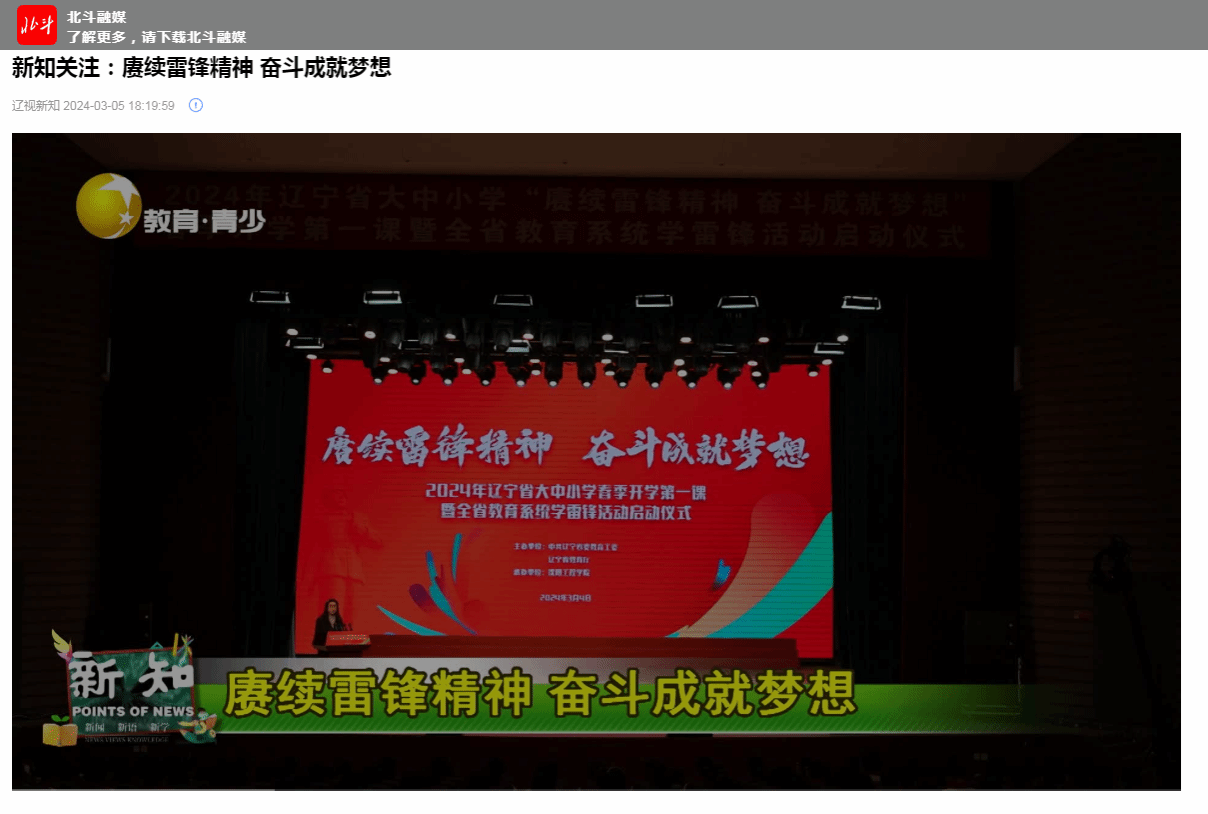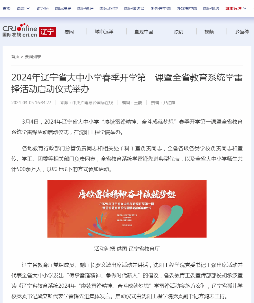 编者按:近日,多家主流媒体以“2024年辽宁省大中小学春季开学第一课暨全省教育系统学雷锋活动启动仪式在沈阳工程学院举办”为题进行报道及转载。现将相关报道转载如下:
