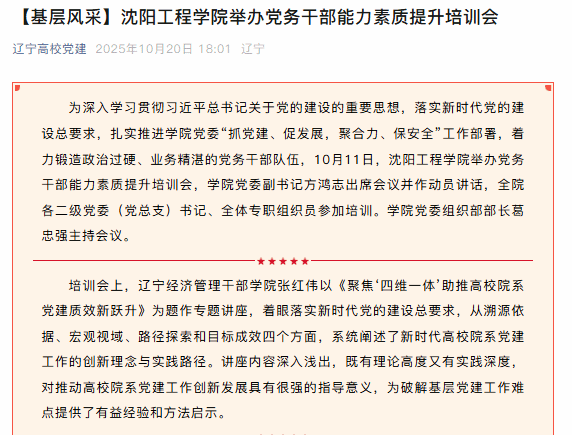 编者按:10月20日,辽宁高校党建以“【基层风采】沈阳工程学院举办党务干部能力素质提升培训会”为题,就我校举办党务干部能力素质提升培训会一事进行报道。此次培训紧扣党的建设重要思想与新时代党建总要求,落实学院党委工作部署,着力锤炼高素质党务干部队伍,为学校发展筑牢党建根基。现将报道原文转载如下: