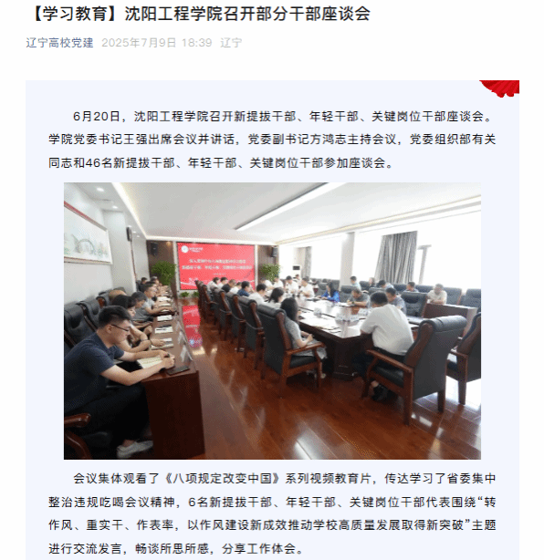 编者按:7月9日,辽宁高校党建以“【学习教育】沈阳工程学院召开部分干部座谈会”为题,就我校召开新提拔干部、年轻干部、关键岗位干部座谈会,激励领导干部以精益求精的态度、“功成不必在我”的作风,锐意进取、埋头苦干,像雷锋一样做一颗永不生锈的“螺丝钉”,在学院“一融三高”的“赶考”之路上展现更多担当作为一事进行报道。现将报道原文转载如下: