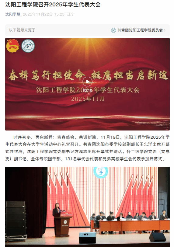 编者按:11月22日,辽宁学联以“沈阳工程学院召开2025年学生代表大会”为题,就我校为青年学子搭建了参与校园民主政治建设的重要平台,引导广大青年学子在参与学校治理中增强主人翁意识,在维护合法权益中提升民主素养,在服务发展大局中彰显使命担当一事进行专题报道。现将报道原文转载如下: