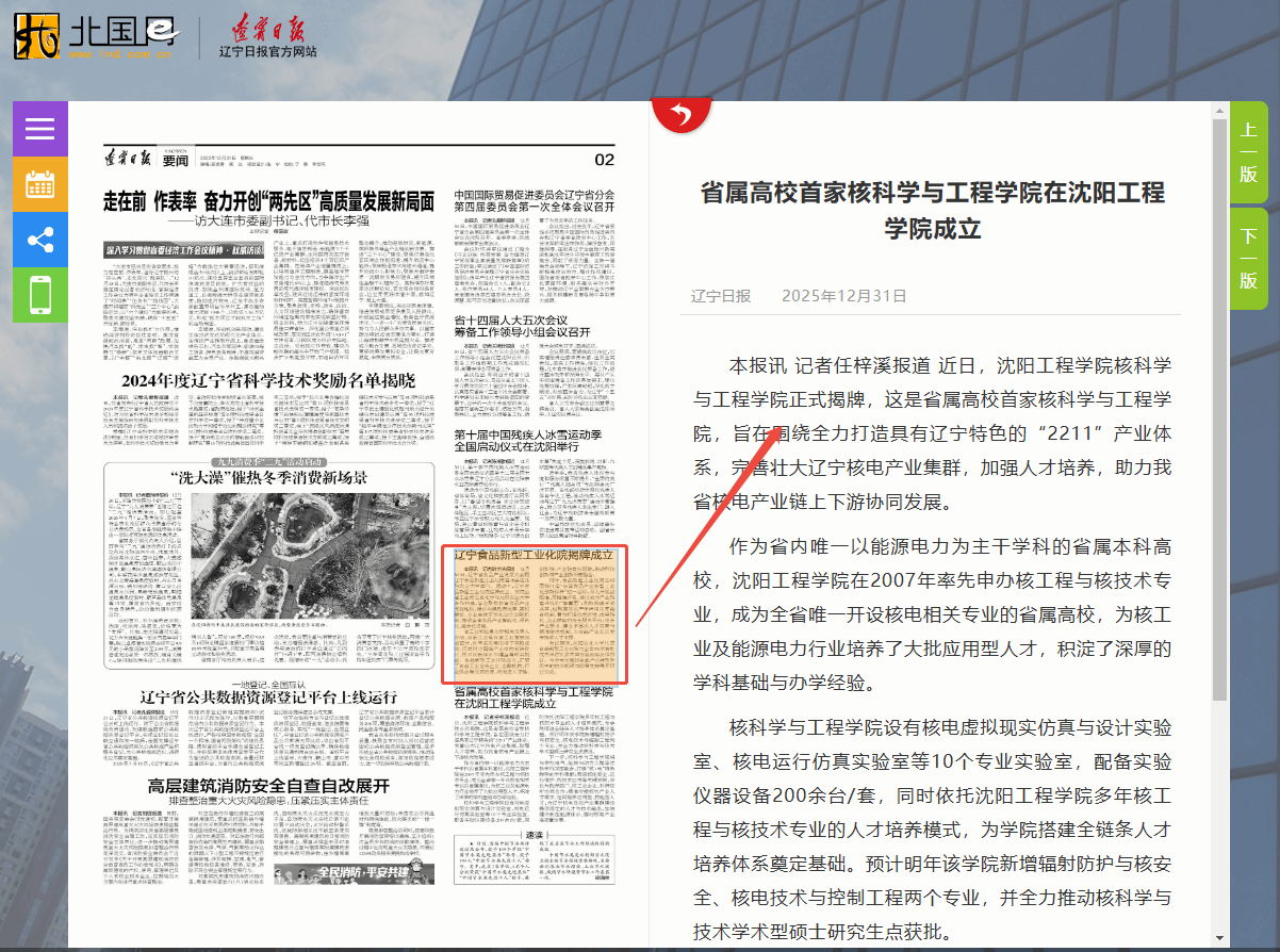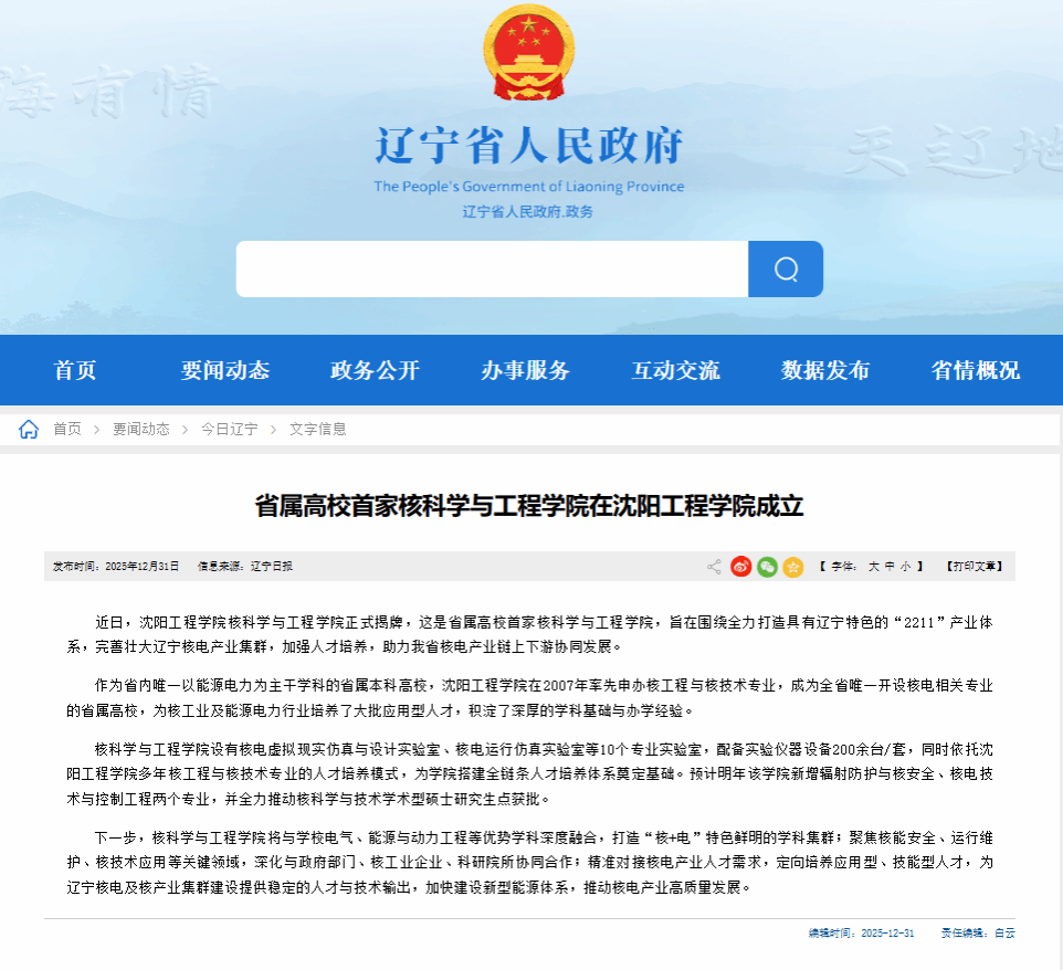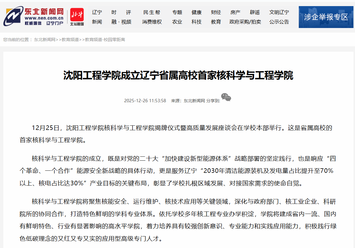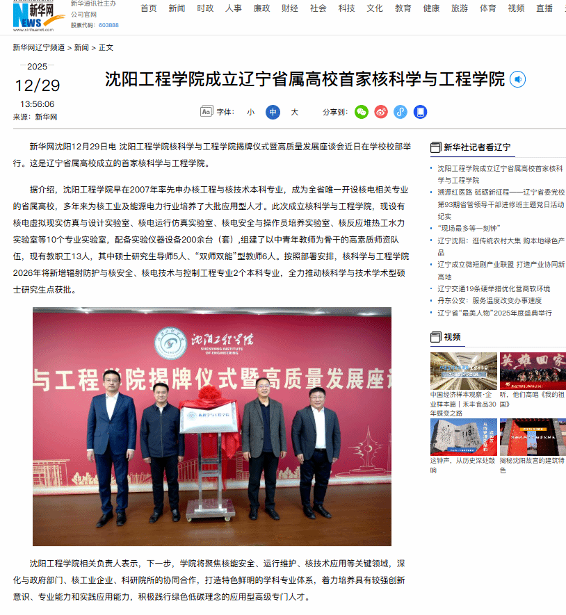 辽宁省人民政府 辽宁省教育厅 新华网 辽宁日报 学习强国辽宁平台等多家媒体报道:沈阳工程学院成立辽宁高校首家核科学与工程学院