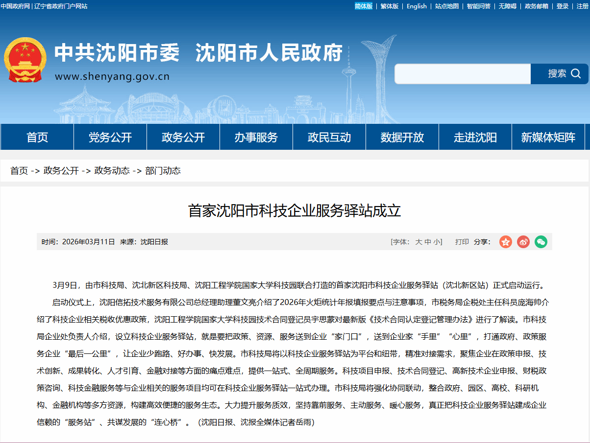 【沈阳市人民政府】首家沈阳市科技企业服务驿站成立