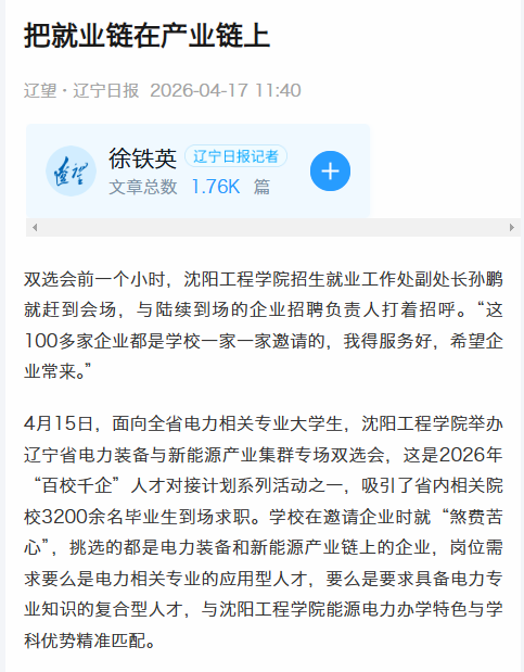 编者按:4月17日,辽宁日报以“把就业链在产业链上”为题,就我校深入实践“百校千企”人才对接计划、推进“百万学子留辽来辽”专项行动,举行辽宁省电力装备与新能源产业集群双选会一事进行报道。现将报道原文转载如下: