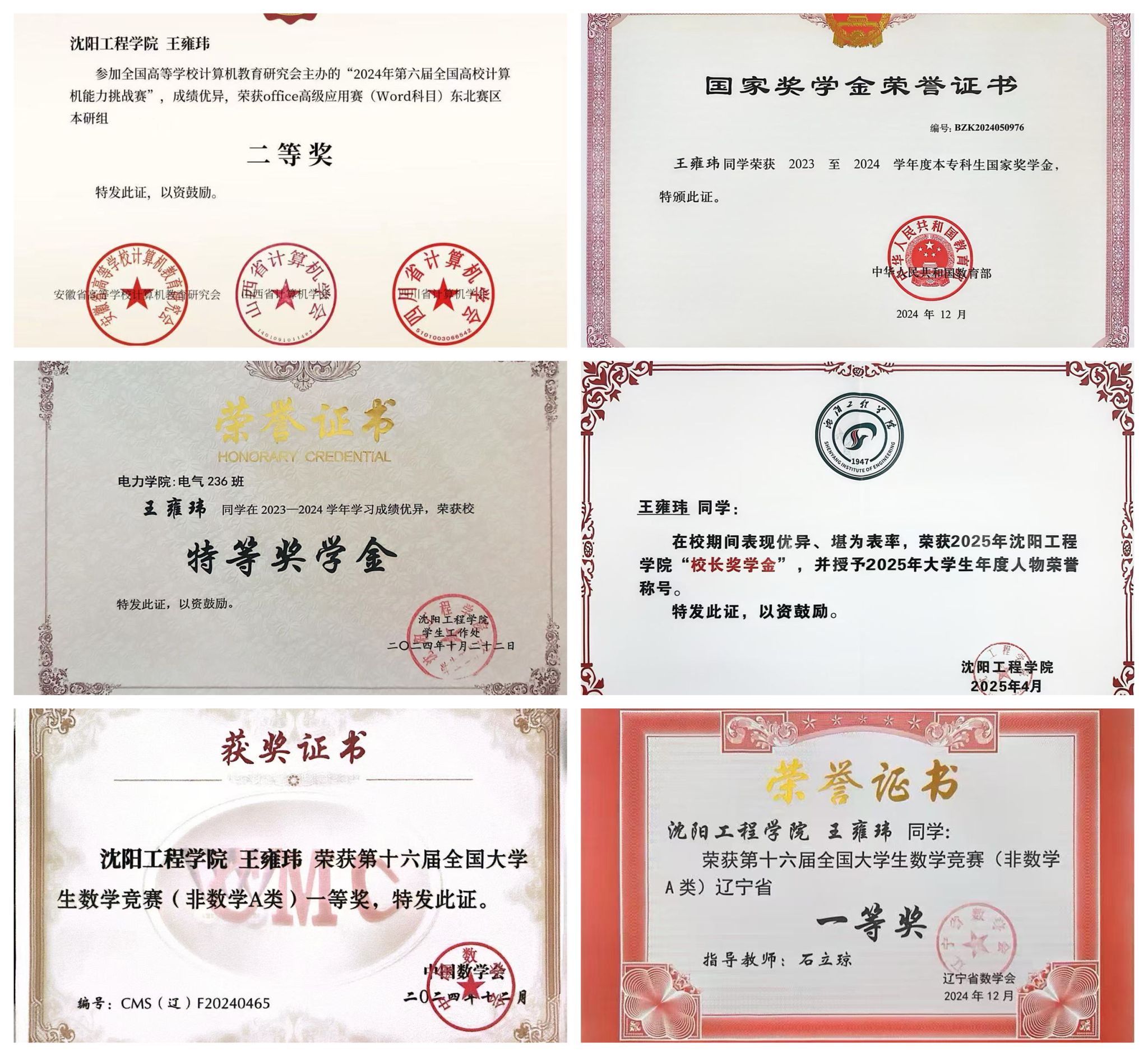 求学路上,王雍玮深知,作为一名电力专业的学生,只有掌握扎实的专业知识,才能更好地服务于社会、服务于国家。因此,他始终保持着对知识的渴望和对学术的追求,截至目前,25门课程突破90分,3门课程满分收官,8.22的平均学分绩点使他连续两学期在专业中排名第一,荣获了国家奖学金、全国大学生数学竞赛金奖等多项荣誉。